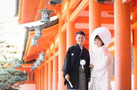 紅葉のタイミングの結婚式を選んでくださったおふたり。京都に招くゲストも喜んでいただけたことと思います。 平安神宮の朱色の回廊と紅葉、おふたりのテーマカラー紅白ともマッチし印象的な結婚式となりました。