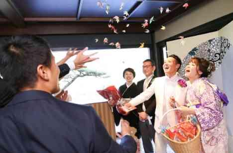 披露宴では、ゲストの皆様にご参加いただく演出もお考えになったおふたり。ファーストバイトの前に先輩ご夫婦にお手本バイトに参加いただいたり、ゲストの皆様から折り鶴シャワーをいただいたり。お誕生日のゲストにはサプライズでバースデープレートをご用意されたりとおもてなしもバッチリでした。