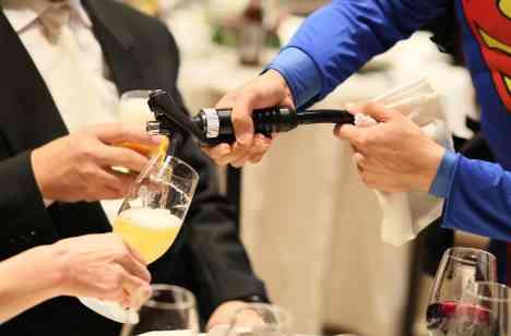 振袖姿で新婦様が再入場、新郎様は、、、ヒーロー衣裳に身を包み新婦様とは違う入場口から登場され、会場を明るい笑い声に包まれました。大きなビールサーバーを背負って登場された新郎様は皆様のテーブルを回り、ビールでおもてなしと記念撮影に応えます♪会場内の雰囲気も一変しおふたりのおもてなしは大成功をおさめました。