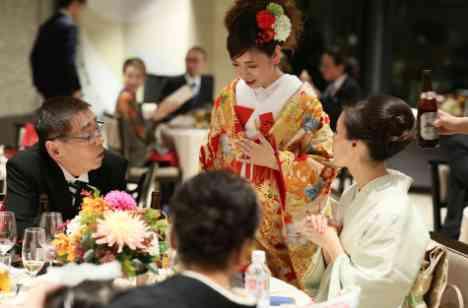 家族との時間だからこそ、演出をいれず、シンプルな進行にされたおふたり。メインテーブルにいるのではなく、おふたり自身がゲストのもとへ足を運び、ご挨拶やビールのサービスなど、普段の感謝の気持ちをたくさん込めておもてなしをされました。
