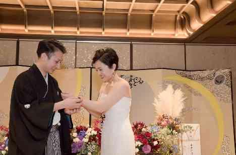 披露宴では新婦様はウェディングドレスにお色直し、新郎様は紋付のまま、和・洋を合わせるおしゃれなコーディネートに。 おふたりの誓いをカタチにした、おふたりの大好きな腕時計をお互いに交換する演出をなさいました。