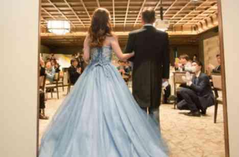 後半では一転、ボリュームあるライトブルーのドレス、ダウンスタイルのスタイリッシュなお姿にお色直しをされた新婦様。実は、挙式風入場でのご入場はお父様にはサプライズ。手を取って進む一歩一歩が印象的なお時間となりました。おふたりのおもてなしの想いが詰まったご結婚式は、ゲストの皆様と過ごす思い出深い一日となりました。