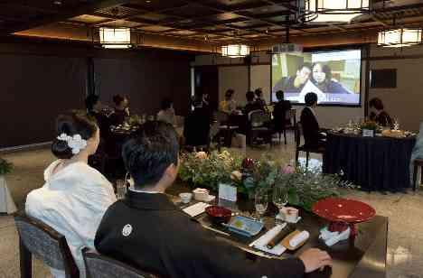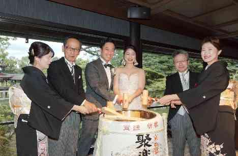 演出は和の雰囲気に合わせて、ご両親と一緒に鏡開きを行われました。また、一日を通して会場でお過ごしいただいたため、朝夕で雰囲気が変わる平安神宮会館の魅力を2倍楽しんでいただくことができました。お写真にも日が暮れていく様子が残り、おふたりとゲストの皆様にとって、一生に一度のかけがえのないひとときとなりました。