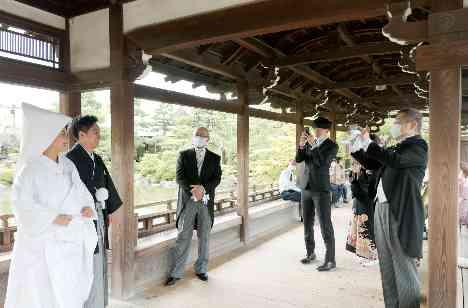 恩師の方にはできる限り安心安全におふたりの姿を見ていただきたい、と挙式のみご参列いただくことにされました。当日は一般非公開の平安神宮儀式殿にて大切な皆様に見守られながら、夫婦としての誓いを結ばれました。挙式後には国の名勝庭園に指定されている神苑やお写真場でのお写真撮影を通して和やかなお時間を愉しまれました。