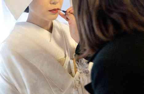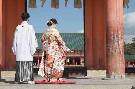 挙式は厳かに平安神宮の儀式殿にて執り行われたおふたり。大切なご家族に見守られながら夫婦としての誓いを結ばれました。またバレンタインということで、テーマカラーはゴールドと赤。白い紋付に金糸の入った袴の新郎様と白無垢にゴールドの小物の新婦様。挙式後は、憧れだった色打掛をお召しになったおふたりのお姿が、青空と朱色の会場に映えていました。