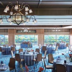 【日本庭園「松濤園」を望む披露宴会場】100畳の「大広間」2階から松濤園を一望できる「Over the Moon」人気の2会場をおふたりのゲスト人数やウエディングニーズに合わせた会場をご提案します。