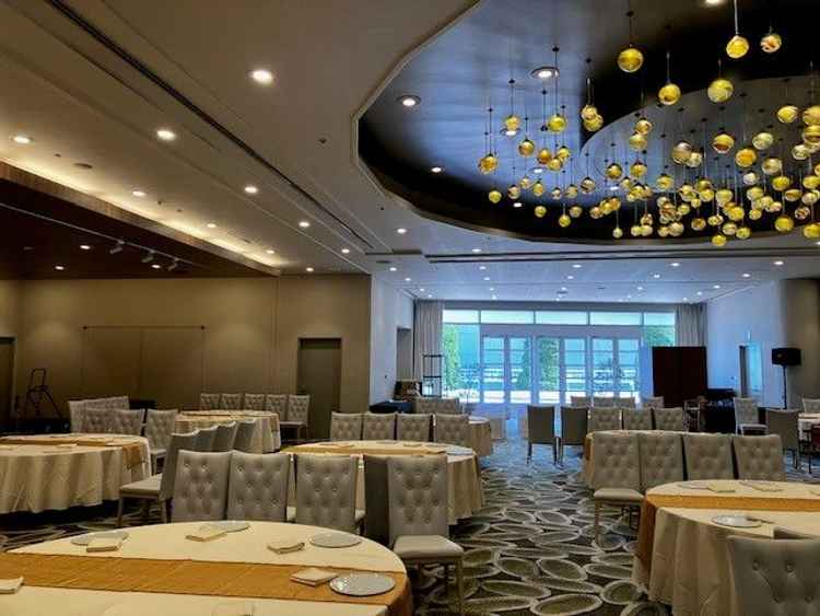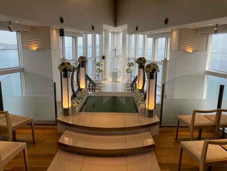 式場から見える海の景色がとてもきれいだった。披露宴会場もとても広く、ゆったりとした披露宴を開けそうだと感じた。