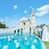 【水上に浮かぶ独立型大聖堂で挙式体験】天井高10M・バージンロード20Mの圧巻のスケール感。自然光が降り注ぎ青×白のコントラストが美しいと話題。挙式の後は大階段で憧れのフラワーシャワーも叶う