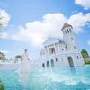 【水上に浮かぶ独立型大聖堂で挙式体験】天井高10M・バージンロード20Mの圧巻のスケール感。自然光が降り注ぎ青×白のコントラストが美しいと話題。挙式の後は大階段で憧れのフラワーシャワーも叶う
