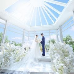 【水上に浮かぶ独立型大聖堂で挙式体験】天井高10M・バージンロード20Mの圧巻のスケール感。自然光が降り注ぎ青×白のコントラストが美しいと話題。挙式の後は大階段で憧れのフラワーシャワーも叶う