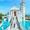 【水上に浮かぶ独立型大聖堂で挙式体験】天井高10M・バージンロード20Mの圧巻のスケール感。自然光が降り注ぎ青×白のコントラストが美しいと話題。挙式の後は大階段で憧れのフラワーシャワーも叶う