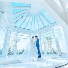 【水上に浮かぶ独立型大聖堂で挙式体験】天井高10M・バージンロード20Mの圧巻のスケール感。自然光が降り注ぎ青×白のコントラストが美しいと話題。挙式の後は大階段で憧れのフラワーシャワーも叶う