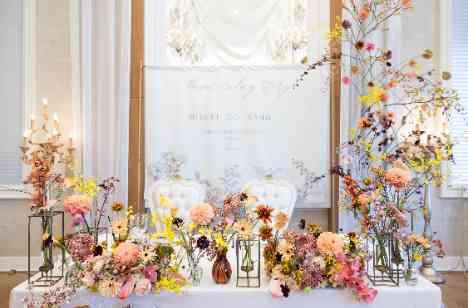 出逢いは何とYUKI様が落とした携帯電話をKAHO様が拾ったことから始まった運命的なおふたり。結婚式は妥協せず、理想の空間を作り上げたいと一つ一つのアイテムにとことんこだわって準備を進めていきました。洗練されて抜け感ある海外ウエディングのような雰囲気にしたいと、インスタグラムやSNSでの情報収集も沢山され、当日はゲストも「さすがお洒落なふたりだね」という声があがるような素敵な空間となりました。