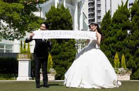 ゲストを楽しませたい!と挙式の後におふたりが用意されたのはガーデンでのウェルカムパーティー。おふたりがゲストを会場でお出迎えしてウェルカムスピーチやウエディングケーキの入刀セレモニーを行いました。ユーモアあふれるご新郎様はウェルカムスピーチの際の”カンペ”をこ存在感あるバナーのような大きさでご用意。おふたりらしいオリジナリティ溢れる演出にゲストも笑顔でいっぱいのシーンとなりました。