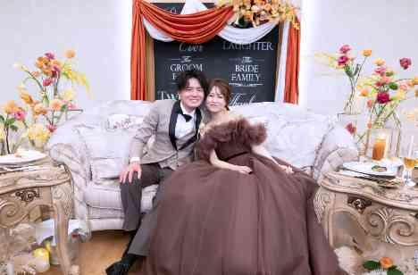 お洒落でセンスが光るお二人がこだわった会場コーディネート。11月の結婚式ということで秋らしさを満点に取り入れました。お色直しはトレンドのブラウンカラーのボリュームたっぷりのカラードレスに。ドレス姿全身がしっかりと見えるようにソファのメインテーブルにしてゲストと沢山お写真を残しました。「ふたりらしいね」との声を沢山ゲストからいただきました。