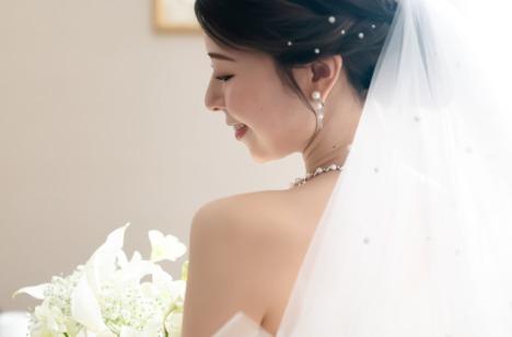 拘りぬいたいくつかのショットの中で、アップスタイルと左側のパール装飾が印象的。 笑顔で微笑みながら撮影し、これから挙式に向かう緊張感も伝わるワンカットに。 ドレスもベールもブーケも拘りぬいた1点に。 またこの後バッサリと切るとはだれも想像できないアップスタイル。 メイクルームにも窓のある空間なので、自然光も映える。