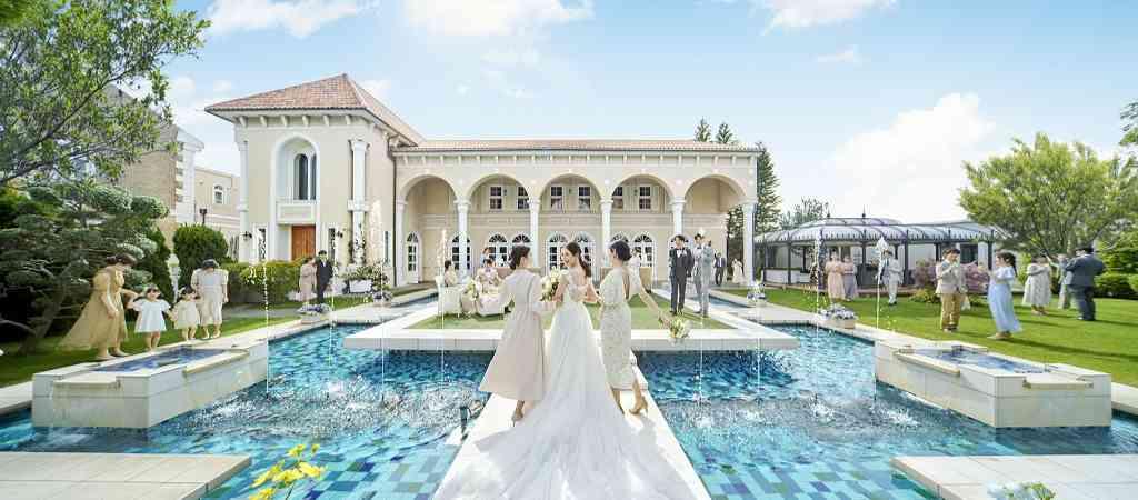 【ヴェネツィア邸(~160名)】関西最大級の水上ステージ付きのガーデン&開放感溢れる空間でゲストとの時間を。階段入場や最新演出のプロジェクションマッピングでこだわりを叶えて