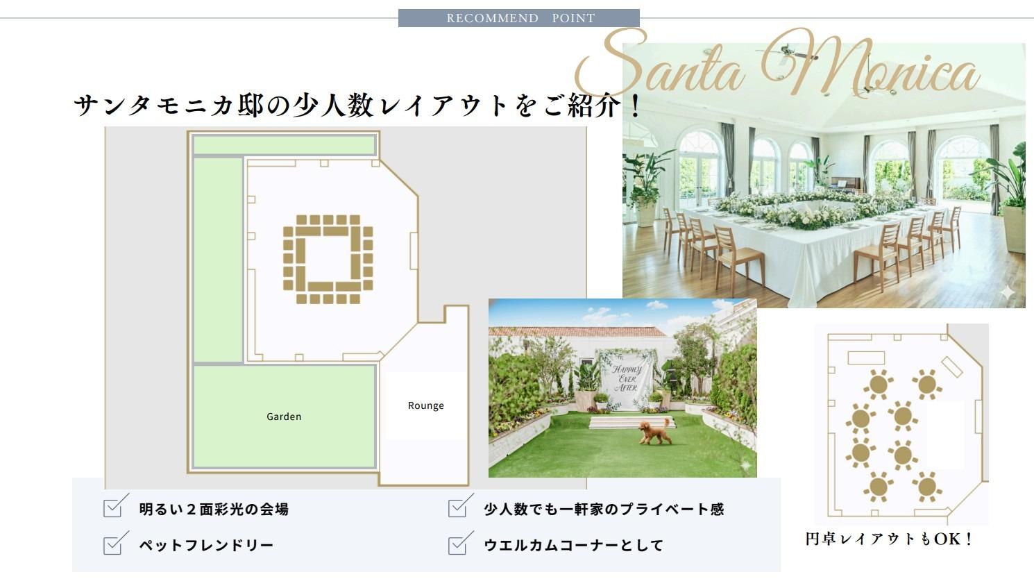 【サンタモニカ邸(~70名)】西海岸にある別荘をイメージしたダイニングは3面ガラス張りで開放的なパーティーにぴったり。、アットホームなパーティーに丁度良いスケール感。