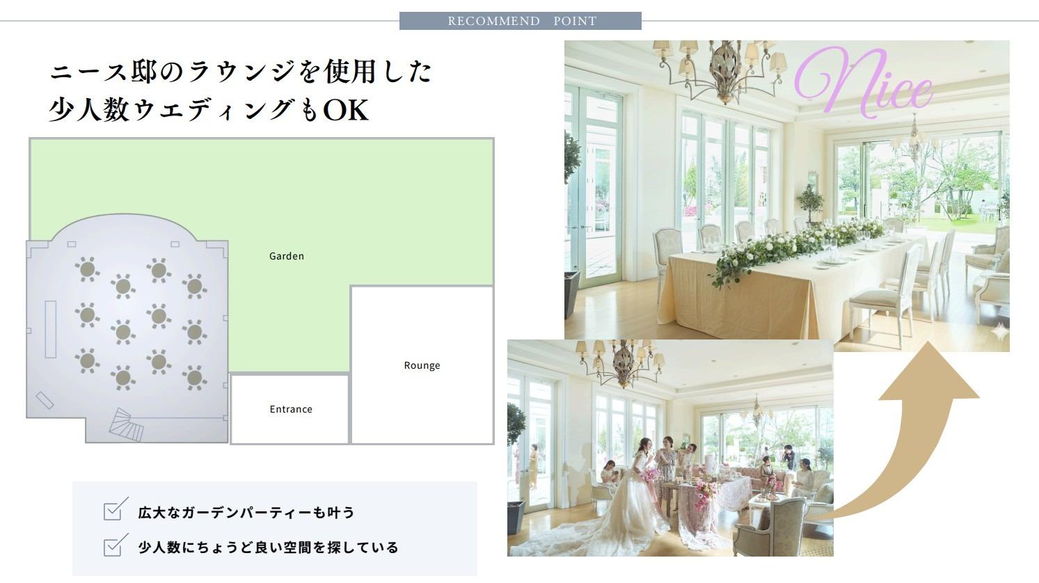 【ニース邸(~107名)】南フランスの一軒家のような趣のダイニングは、白を基調にした自身の色に染められる♪緑が鮮やかなプール付きガーデンでは、ウエルカムパーティーやデザートブッフェも叶う