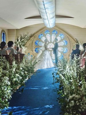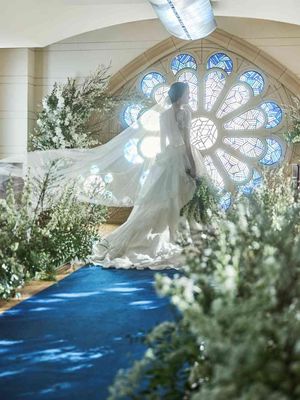 高貴な色としても有名な【青】のバージンロード 青×白に包まれた感動的なチャペルはゲストもうっとり。装花アレンジもOKだからイメージを伝えてみて!