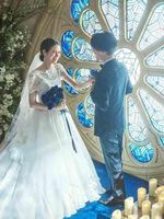 純白のウェディングドレスを より輝かせるステンドグラス お2人が正面にお立ち頂くと お花の中にいるような可愛らしい写真が撮影できる