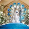 【150年もの歴史がある青のステンドグラス】「幸せを重ねる」そんな意味が込められた12枚の花びら型にラピスラズリが配され、そこから自然光が差し込む鮮やかな青色が特徴。ブルーローズセレモニーも人気