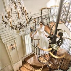 【自然光差し込むクラシカルな空間】パーティ会場は天井高11mの吹き抜けで、2階のラウンジと繋がる螺旋階段の入場はゲストから注目が集まる人気演出。アンティークに彩られ少人数~大人数パーティまで柔軟に対応