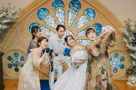 挙式の後は披露宴会場に案内される一般的な流れの結婚式ではなく、皆と写真を残したい!そんな思いからチャペルのステンドグラスでのフォトタイムを提案。おふたりが一目惚れした青色のお花の形をした唯一無二のステンドグラス。新郎新婦だけの写真ではなく、ゲストとも一緒に記録に残せる、貸切だからこその演出です。写真だけではなくおふたりとの会話も楽しめるシーンに。