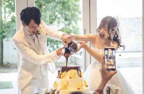 ウエディングケーキは、私たちが好きなチョコバナナをモチーフにしました。ウエディングプロデューサーと一緒に試行錯誤しながら、クリーム色のバナナクリームケーキに、チョコソースをドリップする「チョコバナナケーキ」に辿り着きました。ウエディングプロデューサーさんがとてもがんばってくれて、私たちだけでは実現できなかった、本当に理想以上に素敵なチョコバナナケーキが誕生しました!!