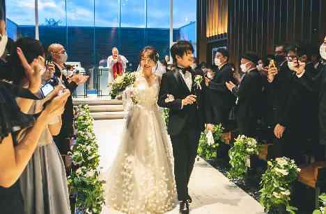 挙式前にゲストが立ち寄るウェルカムスペースには、それぞれの地元のお菓子を置いたり、マスクを脱着する機会が多いと思ったので、マスクケースをこちらで用意したり、細かい所にも配慮を忘れないように心がけました。私たちは、夕方からの挙式だったので、日が落ち切る前の美しい光が優しくチャペルに降り注ぎ、夕方ならではの幻想的な雰囲気で式を挙げることができました。