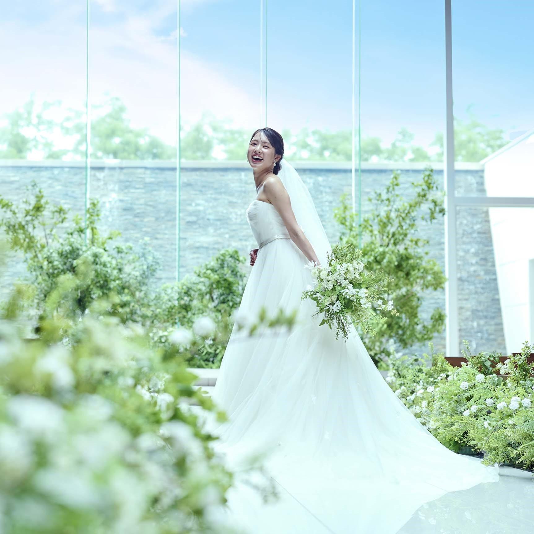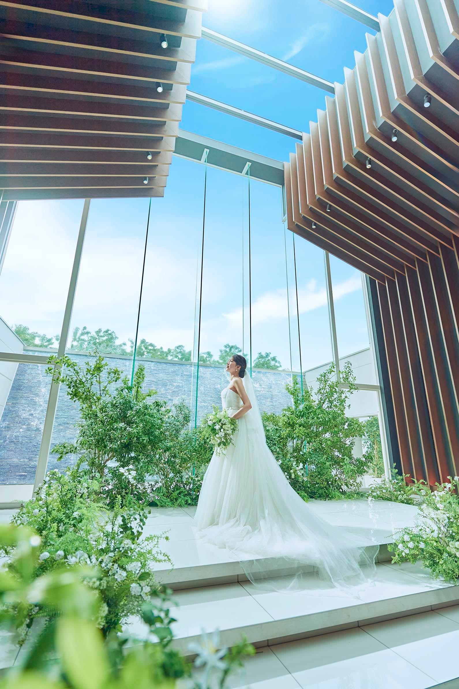 光と水と緑、やさしい自然と祝福に満ちた特別なチャペル。 正面のガラスは天窓まで繋がり、自然光溢れる感動のセレモニーを実現。 雨でも安心の全天候型チャペル。