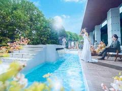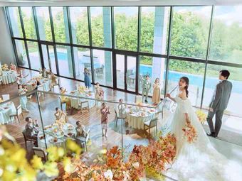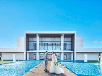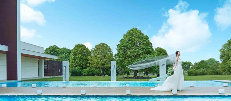 おふたりのご結婚式の第一印象にも繋がる圧巻のエントランス!ガーデンには、広大な水辺が広がり、まるでリゾートに訪れたような雰囲気に…皆様と楽しむバルーンセレモニーも大人気★エントランスは、人気フォトスポットのため、前撮り撮影をご希望いただくことも可能です◎