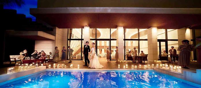 プール付きのガーデンを眺めるご披露宴会場では、特別感に溢れる階段入場も叶う♪