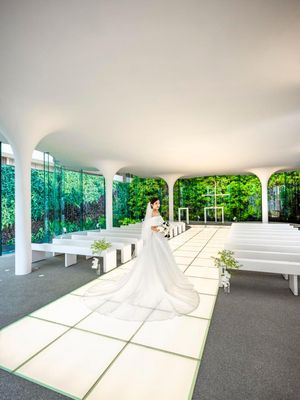 世界で数々の賞を受賞してきた設計デザイナーの松本哲哉氏により創り出された美しいデザイン 水盤に浮かぶ雲をイメージしたチャペルの輪郭は全て曲線で描かれています
