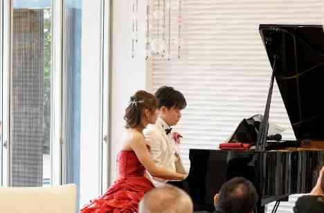 「一生に一度の機会にふたりで何か形に残るものを」と、ゲストの皆様に『水平線』の曲をピアノで連弾し披露したおふたり。 忙しい準備期間の中、当日まで何度も会場に足を運び一緒に練習を重ねたお二人。前日はまだおぼつかない部分があった新郎様も当日では息ぴったりの完璧な演奏におふたりらしさ溢れるすてきな披露宴の締めとなりました。