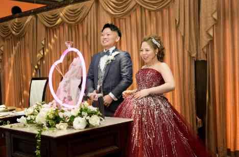 御新婦様が選ばれたお衣装は「ゴージャスの赤でキラキラがとても可愛いかったので選びました」と喜んでいただきました。このゴージャスな会場にぴったりのお衣装が映えていたと思います。ラヴィーナ姫路では約130点のカラードレスを常時取り揃えております。たくさんありすぎて迷ってしまいそうですが、そこはプロのドレスコーディネーターがお客様にぴたりのドレスをお勧めさせていただきます。