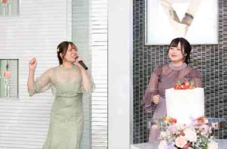 新郎様の妹様が実家の岡山県まで映像を撮影に行き、お二人のために替え歌を作成し、映像に合わせて歌を披露されました。ご実家の岡山県の風景などを撮影し、妹様も変装して映像を作成されるなどかなり力の入った作品となっておりました。ラヴィーナ姫路の披露宴は2時間40分を設定しており、ゆっくりとお時間をお使いいただけます。このお二人のようにご家族からの余興でもお時間をかけてお祝いの気持ちをお伝えいただけます。