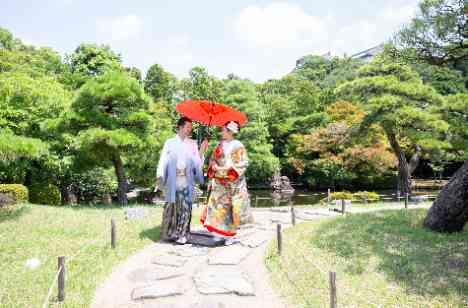 前撮りで好古園に、ロケーションフォトを撮影に行きました!お天気にも恵まれ、素敵なお写真を残すことができました。お二人は白無垢・色打掛・ウエディングドレス・カラードレスを前撮りで撮影し、雰囲気の違うお写真をたくさん撮影いたしました。前撮りで撮影されたおお写真を使ったウェルカムグッズはとても可愛らしかったです!