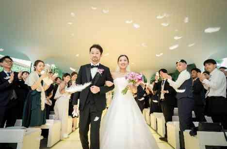 いつもニコニコされているお二人、当日は少し緊張されているご様子でした。ですが、退場されるときには、ホッとされたのかお二人らしい満面の笑顔で退場されていました。退場時にフェザーシャワーの演出もあり、お二人の後ろ姿に天使の羽が舞い降りて、素敵で神秘的なシーンでした。お写真や映像にも、素敵に残るおススメの演出です。