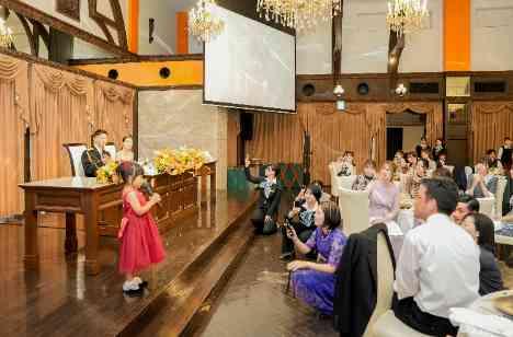 再び姪子様による可愛い演出がありました。披露宴内で友人や会社の同僚がカラオケでお祝いの歌をお届けする場面は良く見受けられますが、このお二人の場合は可愛い姪子様がたくさんの大人のゲストの前で「アイノカタチ」を熱唱されました。とても緊張されたと思いますが、頑張って歌われ、もちろん会場全体が大盛り上がりで、とても暖かい結婚披露宴になったと思います。