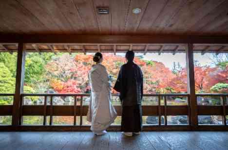 ラヴィーナ姫路での前撮りプランには「ロケーションフォト」というものがあります。通常プランでは式場館内、チャペル、神殿等で撮影して200~300カットの撮影をさせていただけます。ロケーションは式場の外に飛び出して姫路城などで撮影させていただけます。このお二人は「好古園」に足を延ばし、色鮮やかな秋の紅葉の中、とても趣のあるお写真を撮影されました。