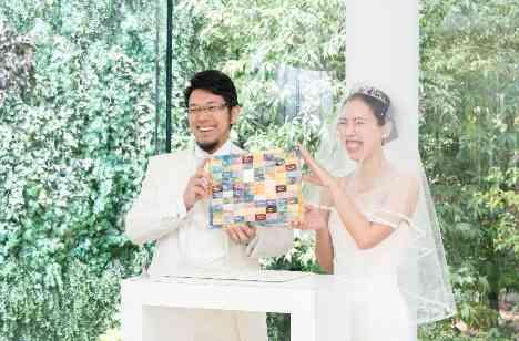 世界に1つしかない結婚証明書を、ご列席の皆様一人一人のお名前と共に造り上げたものです。70枚のピースに一人一人のお名前が記載されており、それをはめ込むことによって完成する特別な結婚証明書となっております。この新郎新婦様はとにかく参加されるご列席の方々を大切にされており、ご自分たちだけが楽しむのではなく、皆様を巻き込んで全員で楽しい結婚式を造り上げることを望んでおられました。
