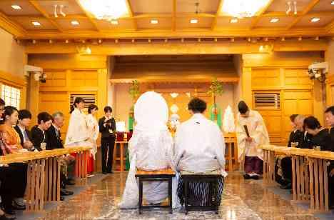 挙式は当会場神殿「大和殿」を使用し、ご親族様のみのご出席で執り行われました。神殿の厳かな雰囲気にとても緊張されていたお二人。大切なご親族様に見守られながらの挙式でしたのでご親族様のお顔を見て、少し緊張が和らいだのではないでしょうか(#^.^#)