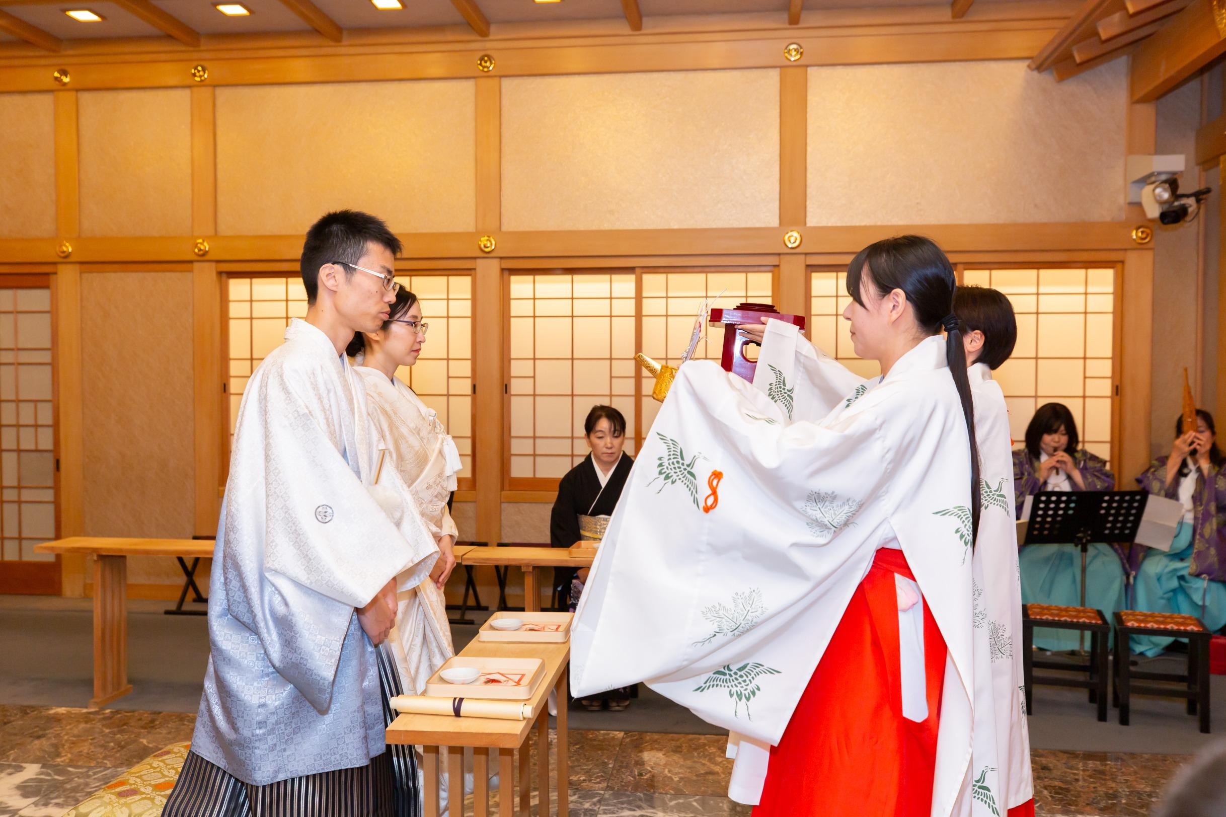 最大52名着席。厳粛な雰囲気の中、両家ご親族の方に手水の儀で手を清めていただきご入場。扉を開くと檜のほのかな香りと笙、篳篥、竜笛の音色が響き渡る和の空間が広がっています。厳かな結婚式を執り行えます。