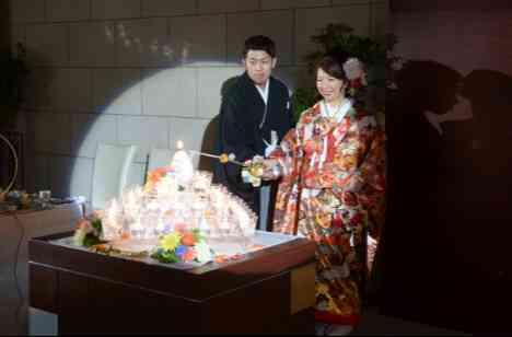 今回は和装でのキャンドルサービスをされました。 少しロマンティックにもなり、落ちついた雰囲気の中で感謝の気持ちを込められ、一卓、一卓にご点火していきました! メインキャンドルの周りはゲストの方にご協力いただき、ご点火いただきました~☆