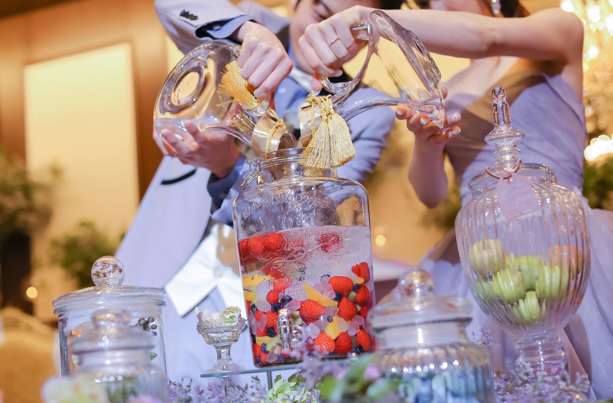 ゲスト全員からフルーツや氷砂糖を集めながら、各テーブルで記念の写真撮影! 最後に新郎新婦様が自らお酒を注ぎ、時間を掛けて果実酒へ仕上がるゲストを繋ぐ演出です。 飲み頃には花嫁様もアルコール解禁か!?