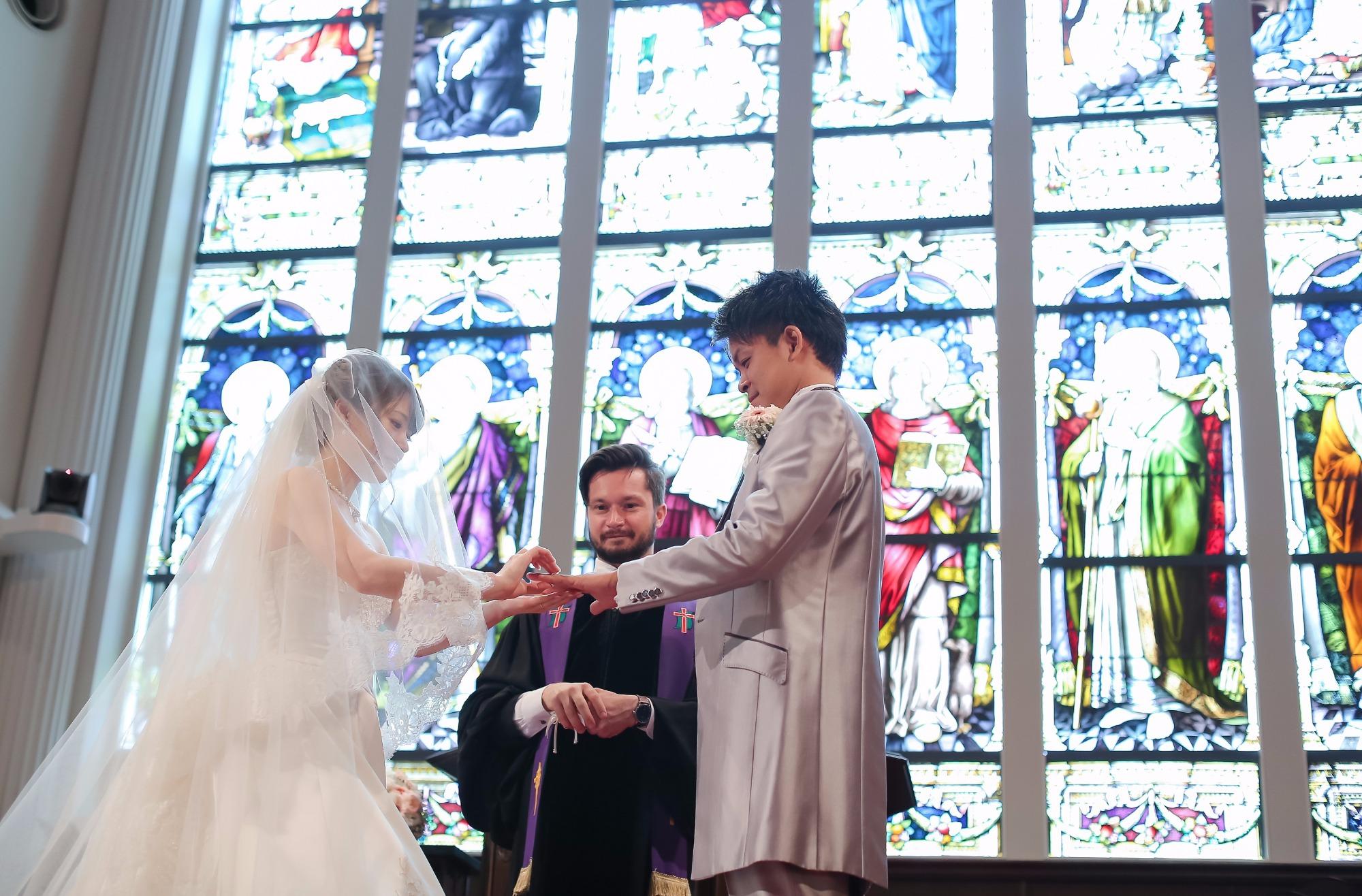 200年の歴史あるステンドグラスのもと、お2人の挙式は執り行われました。生演奏が響き渡る中、愛の誓いを立てるお2人の未来をゲストの方々は息をのみながら見守りました☆