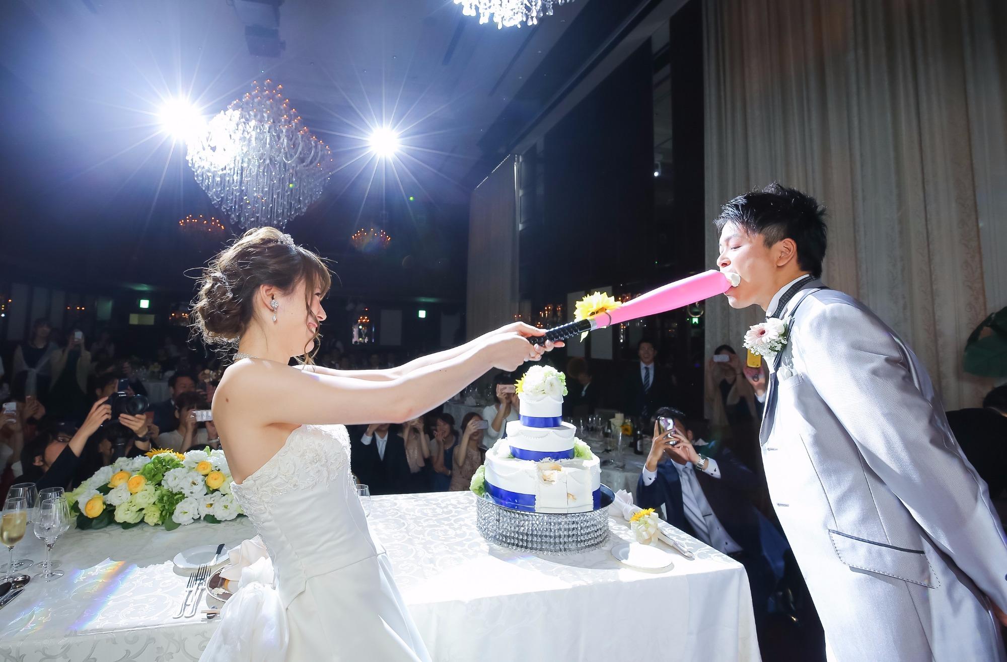 ウェディングケーキのファーストバイトは夫婦としての愛の量を量る意味もあり、手の平ほどあるビッグスプーンでバイトするのはよく見ますよね。 2人はそれではゲストにウケないという事で、野球好きな新郎様の為に花嫁様が「バット型スプーン」を作成! 会場は大いに盛り上がりました♪