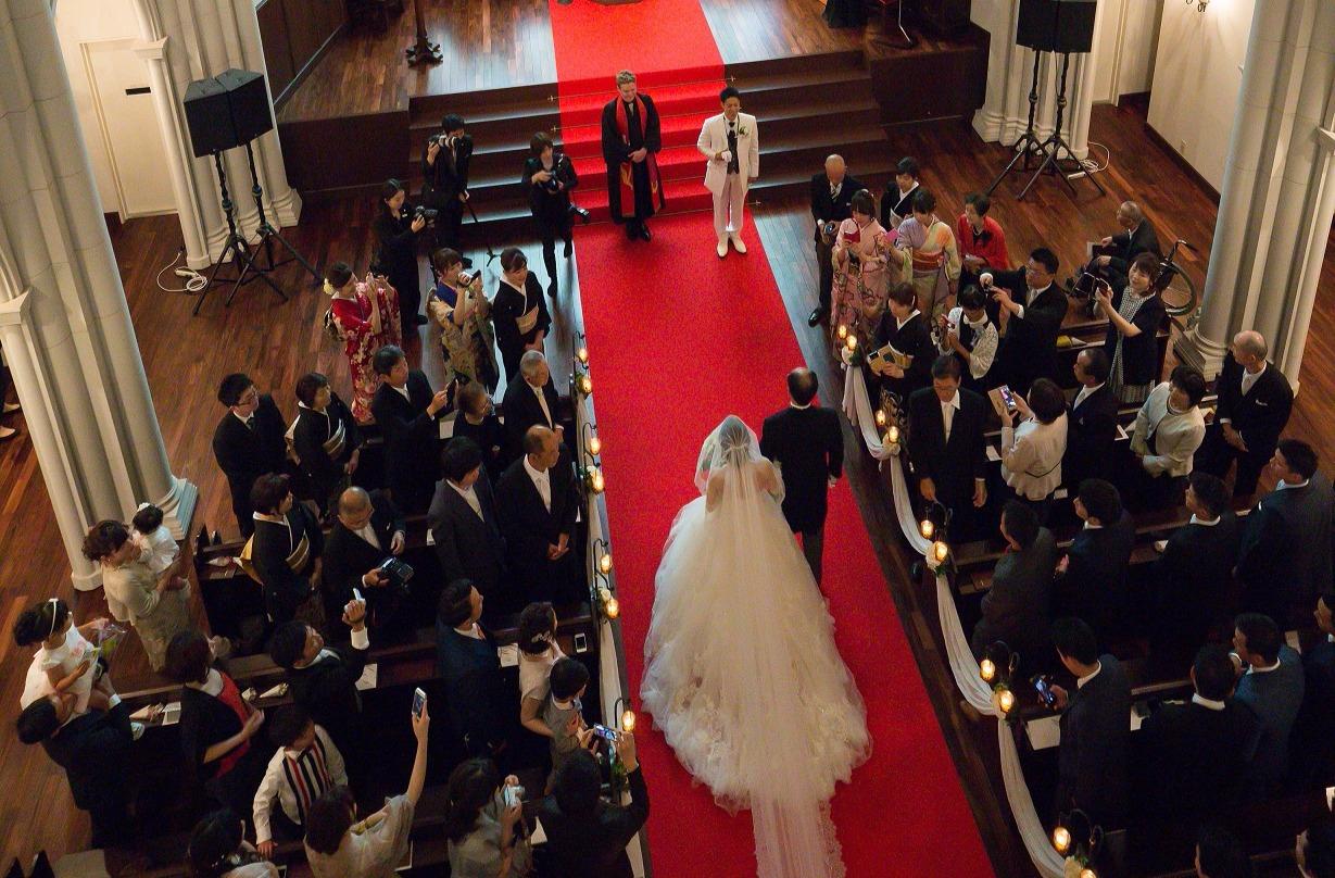 着席数130名を誇る大聖堂。また祭壇が高くなっておるため、ベンチのどこにお掛け頂いてもお2人のお姿が見づらい事はありません。挙式中、お2人の動きを見守りながら、温かい眼差しでご覧頂きました。