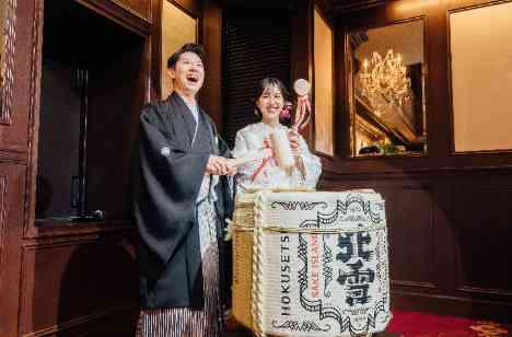 再入場は和装で登場。 和装に合わせて鏡開きのセレモニーも行えます。新郎新婦だけでなくお世話になった皆様の幸せを祈って二人一緒に笑顔で共同作業です。 鏡開きの後は、ご希望があればご自由にお召し上がりいただくことや振る舞い酒も可能です。 普段はなかなか口にすることが無い方でも、幸せのおすそ分けをいただくチャンスですね。